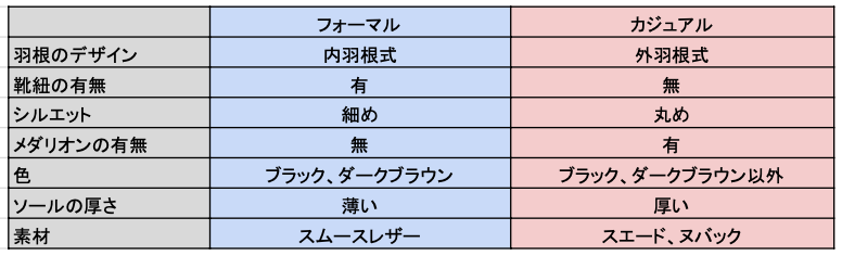 まず、革靴のデザインからフォーマルとカジュアルのどちら向けかを判断します。