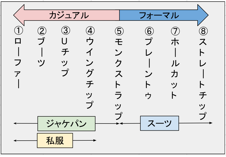 そして、グラフのとおり私服とスーツの両方に合う革靴は存在しないことが私の考えです。